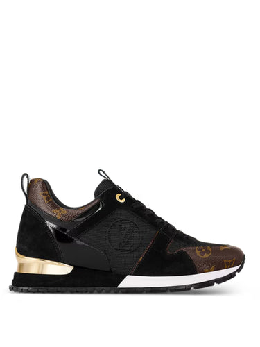 Los sneakers Louis Vuitton LV Run Away en color negro con detalles en oro son un modelo icónico de la marca. Están diseñados con materiales premium que destacan el lujo característico de Louis Vuitton, y suelen presentar el logo de LV o el monograma de la marca en partes estratégicas del sneaker.